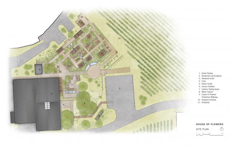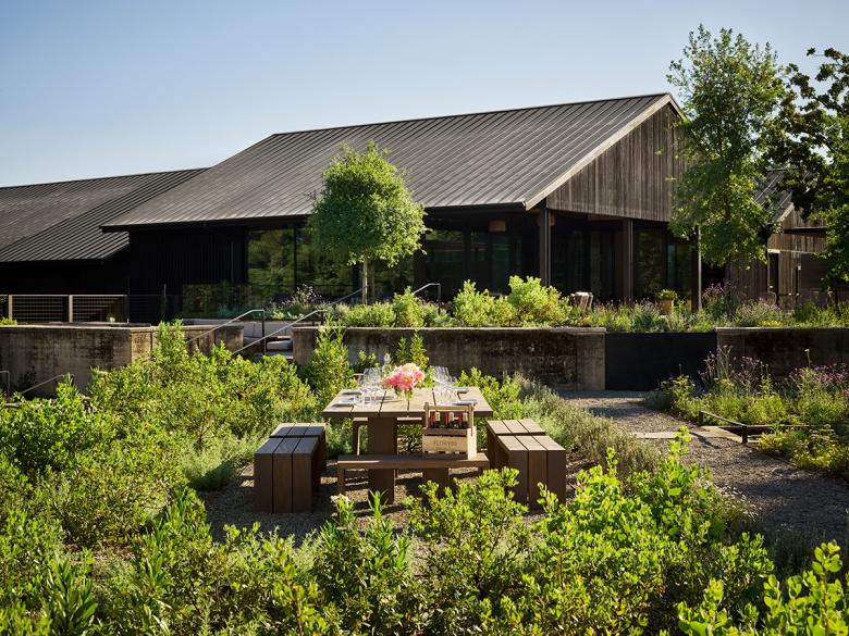 The cultivated flower garden celebrates the relationship between people and land and embodies the agrarian nature of Sonoma vineyards and their dependence on the surrounding ecologies. Flowers reflects this harmony in their sustainable agricultural production methods and it is carried throughout the landscape design through a strategic plant palette that supports pollinator species and the utilization of low-impact maintenance strategies. “In the terraced plantings the visitor is immersed in distinct California ecologies: Redwood Forest, Oak Woodland, and Chaparral landscapes, with views of the vineyards and distant ridges of the Mayacamas Mountains on the horizon,” states Thomas Woltz, principal at Nelson Byrd Woltz Landscape Architects.