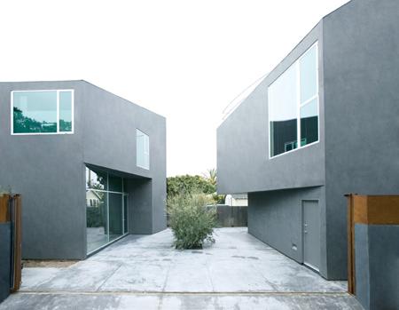 Last year, three young architects collaborated on a trio of two-story additions for a young Persian couple, giving them an extra 2,500 square feet to enhance their 900-square-foot bungalow without overwhelming its more modestly scaled neighbors. The couple works at home-he's an entrepreneur, she's an artist-so they wanted private work spaces, a separate area in which to live and entertain, and a rental unit for income to offset the cost of the expansion. They contacted Ali Jeevanjee, who was then working at Gehry Partners, and he brought in SCI-Arc graduates Steffen Leisner and Philip Trigas. Together they adopted a subtractive design strategy, carving away at a block that represented the total addition and redistributing it to the front, middle, and rear of the long, skinny site. To conform to code, they cut away one side to accommodate a walkway, and they angled each two-story block to maximize sunlight in the front patio and the central courtyard. The angled gray stucco facades and the opposed pitch of the three corrugated metal shed roofs introduce a lively rhythm in the progression of volumes strung out along a linear axis.