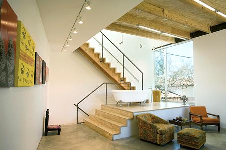 This addition attaches itself to the front of the original bungalow, with its gable roof and tie rods, which is now a dining room and kitchen. Through this space one walks through a bracing arch that frames the newly attached concrete-floored living room and upstairs master bedroom. The snug bedroom borrows space from the stairwell and from the bathing and dressing area on the opposite side. At the rear of the site, beyond a wedge-plan courtyard, is the third pavilion. It contains a rental apartment at ground level and the wife's studio above, from which a top-lit stair leads to the roof terrace, where a shutter rolls up to reveal an expansive opening framing a panoramic view over the neighborhood. The design went through several iterations, allowing the clients to critique the models at each stage. Leisner describes the pavilions as "follies," but each is carefully calibrated to play off the others. Not a foot was wasted and every feature does double duty or offers more than one perspective. Large and small openings are carefully positioned, and they complement expanses of blank wall. Landscaping adds another layer of richness. Water splashing from a pool in the front patio, a wide-branched olive tree, and a profusion of flowering plants are reminiscent of the land the wife left as a child, 20 years ago. Michael Webb