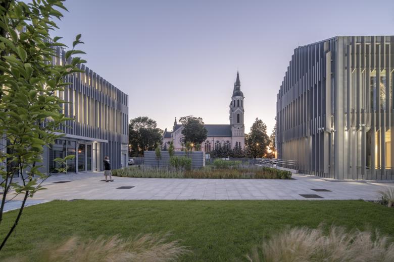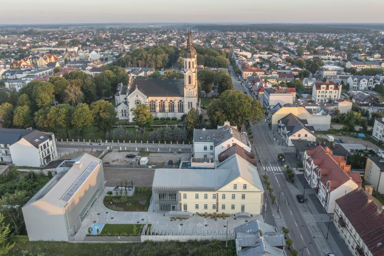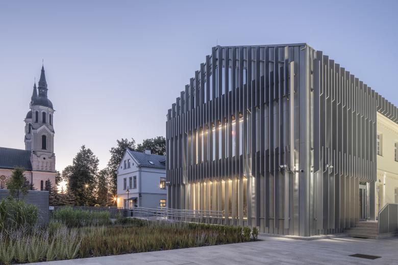 The institution, however, required more space for both exhibitions and administrative functions. The architecture of the new part of the museum—an extension of the existing building and a new structure located deeper within the plot, serving as a spatial counterpoint—continues the form of a townhouse from the turn of the 19th and 20th centuries, with its steep gable roof. Its façade is composed of a structure of vertical rhythms, which, through the sculptural use of light and shadow, gain variability depending on the time of day and year. Designed to serve as a subtle backdrop to the historic building, it also gently references the landscape of Augustów and its surroundings. On a symbolic level, the architecture alludes to the dense forests of the Augustów Forest, which was the place of the tragic events of the Augustów Roundup.