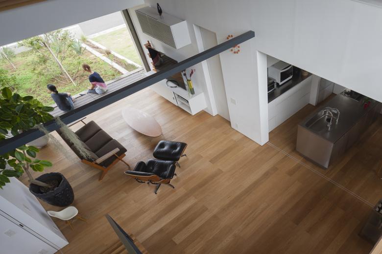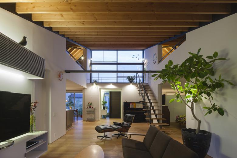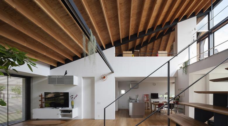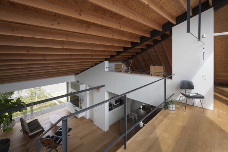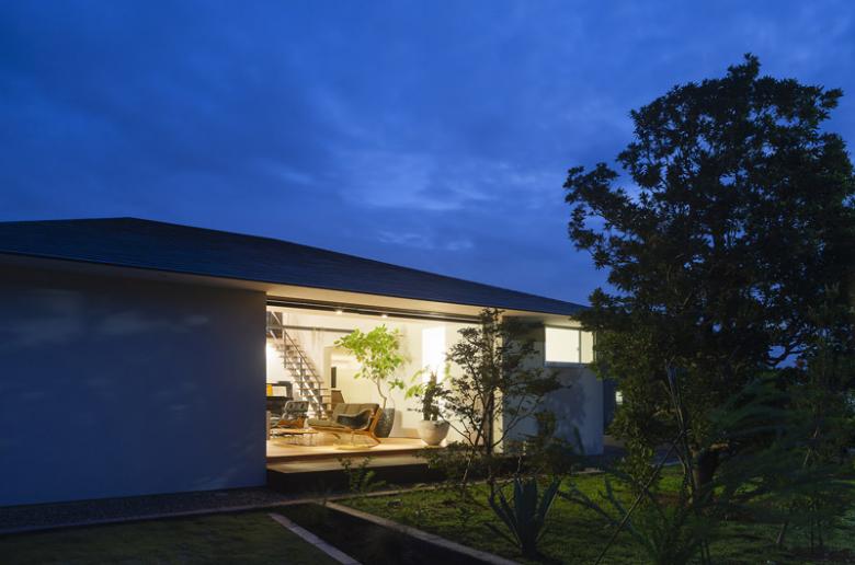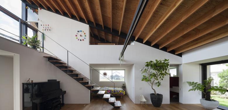 This home for a family of four designed by Naoi Architecture & Design Office sits in a farming-district-turned-suburban-subdivision in Shiga Prefecture. In order to enable a lifestyle in harmony with nature for the outdoors-loving residents, the architects kept the surrounding landscape in mind while designing the ranch-style home. By slicing away one plane of the large hip roof and replacing it with a wall of glazing, they forged a connection with the outside world without sacrificing privacy. “We want to create simple, universal architecture that allows residents to sense the natural world no matter what their surroundings,” say Katsutoshi and Noriko Naoi, the husband-wife team who head the firm, of their approach to design. We asked them about the project.