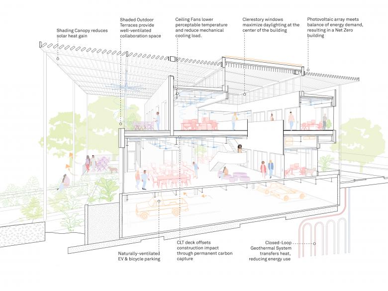 Engaging Transsolar, the environmental engineering consultant for the project, was essential in establishing the energy performance we should expect from a new building and the assumptions we can rely on as designers in an increasingly extreme environment. The building glazing is shaded by a canopy that nearly fills the site while filtered daylight is harvested from all sides. The canopy limits heat gain while producing the electricity the building consumes.