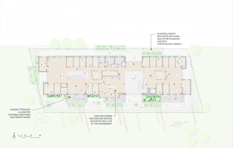 The challenge of the project was to create a building that is simultaneously a front door and a back porch for the organization. The front door is the public representation of the Endowment, formal enough to greet institutional partners while remaining approachable for any member of the community to feel welcome, with a strong sense of belonging for collaborators and first-time visitors alike.