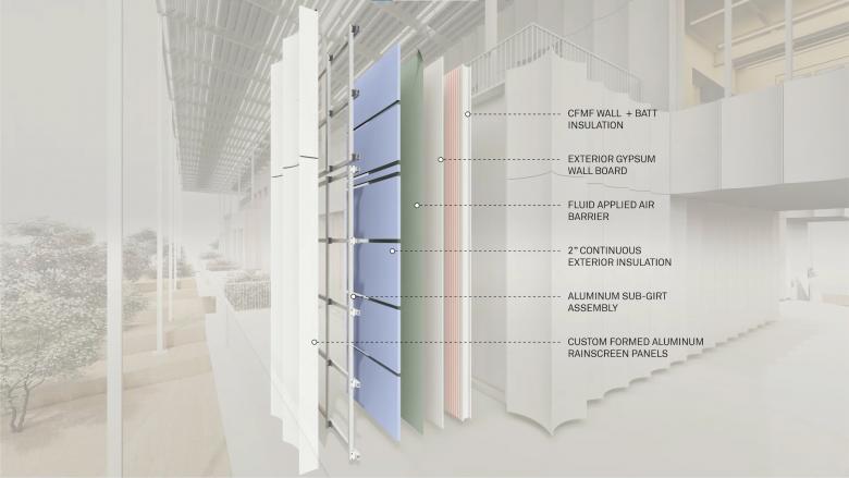 Developing the exterior with fabricator Kinetica, based in Monterrey, Mexico, resulted in the custom-formed, scalloped aluminum rainscreen. The lightness of the cladding, both in materiality and in color, emerged as a critical feature of the building’s performance in the Houston climate, reducing the latent heat of the building’s exterior and minimizing the energy demand of cooling the building.