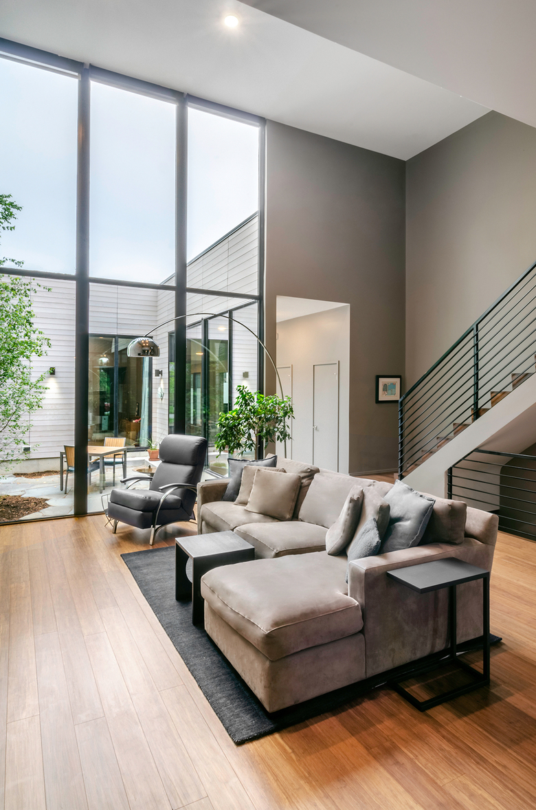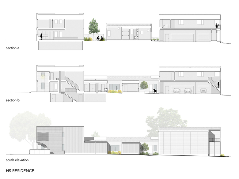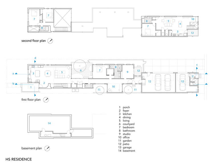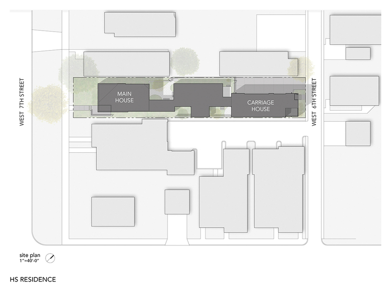 The main house contains the public spaces of the home (kitchen, living room & dining room) on the first floor and guest quarters occupy the second floor, while the carriage house contains a single-bedroom apartment atop garage access for both the owners and guests. In between, single-story volumes are strategically placed to define a series of courtyards. The courtyards allow for varying degrees of daylighting and privacy depending on their solar orientation and proximity to the adjacent homes.
