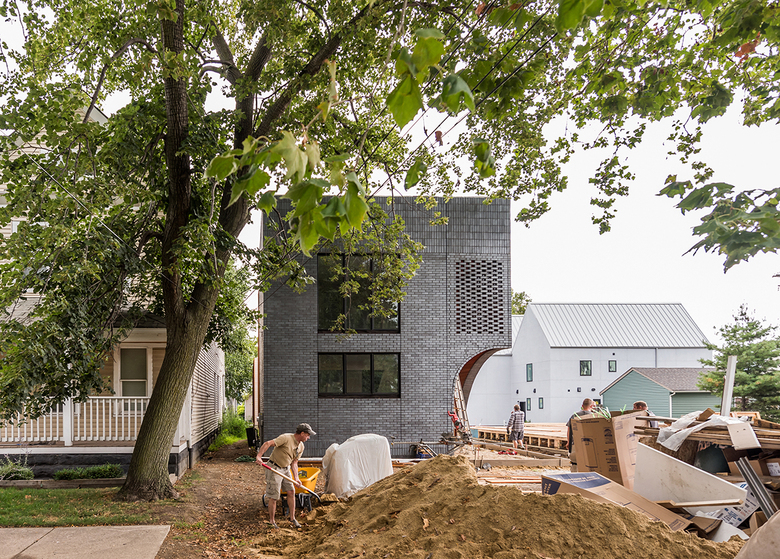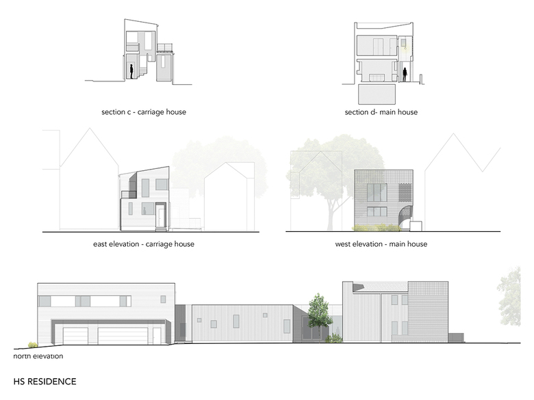 The HS Residence is a single-family home and carriage house in Cleveland, Ohio. The site, located in Cleveland’s Tremont neighborhood, stretches the entire depth of the block (two parcels consolidated), approximately twice the depth of its neighbors. The client, a couple seeking to age in place, requested that all primary living spaces be located on the ground floor. In addition, they requested a private yard for pets, an outdoor patio for entertaining, an exclusive wing for guests, and a detached carriage house for short- and long-term lodging.