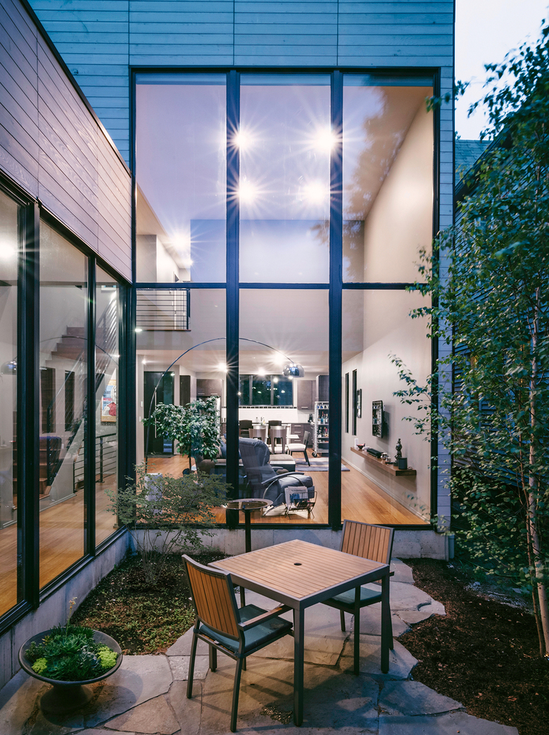 The long, narrow site is nestled between newly constructed townhomes and century-old steel worker cottages. The height of the adjacent homes significantly limited the amount of natural light that could penetrate into the deep floor plan. Thus, the home was conceived as a collection of interconnected volumes, organized around a series of courtyards. Two-story volumes flank each end of the site (the main house and the carriage house) and contribute to the contextual fabric of their respective street.