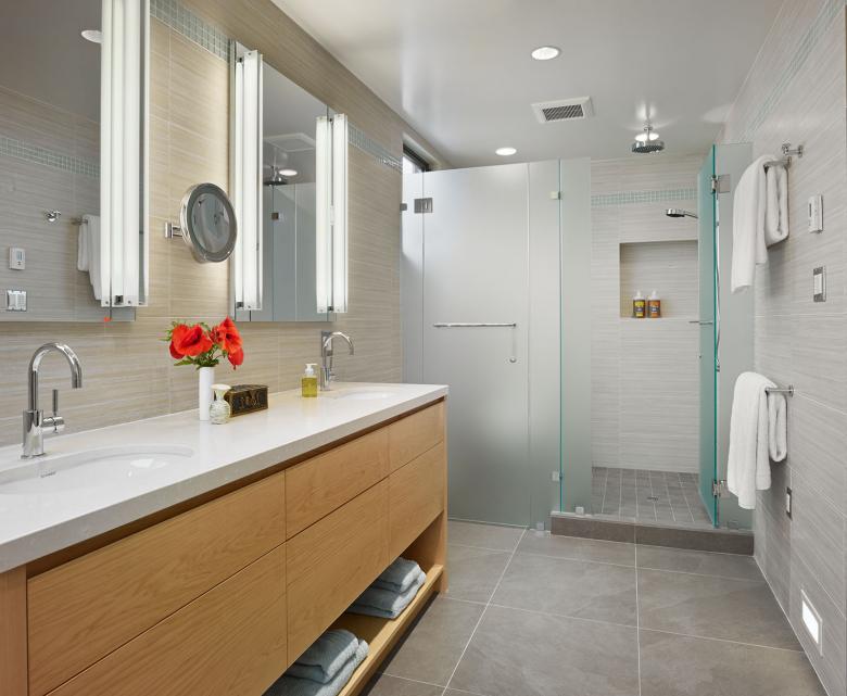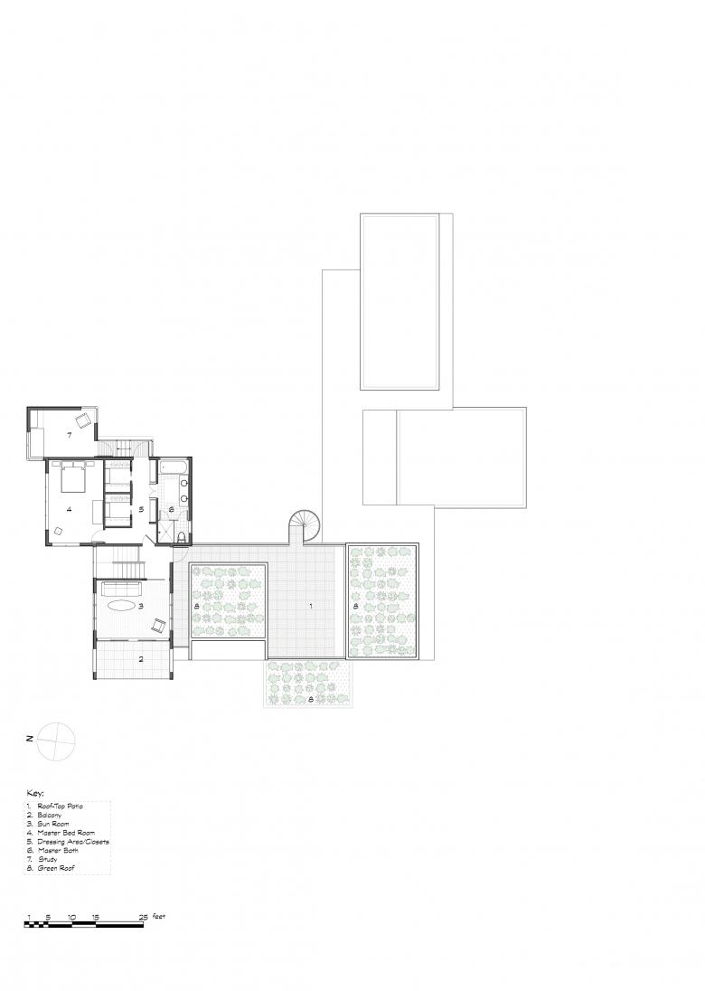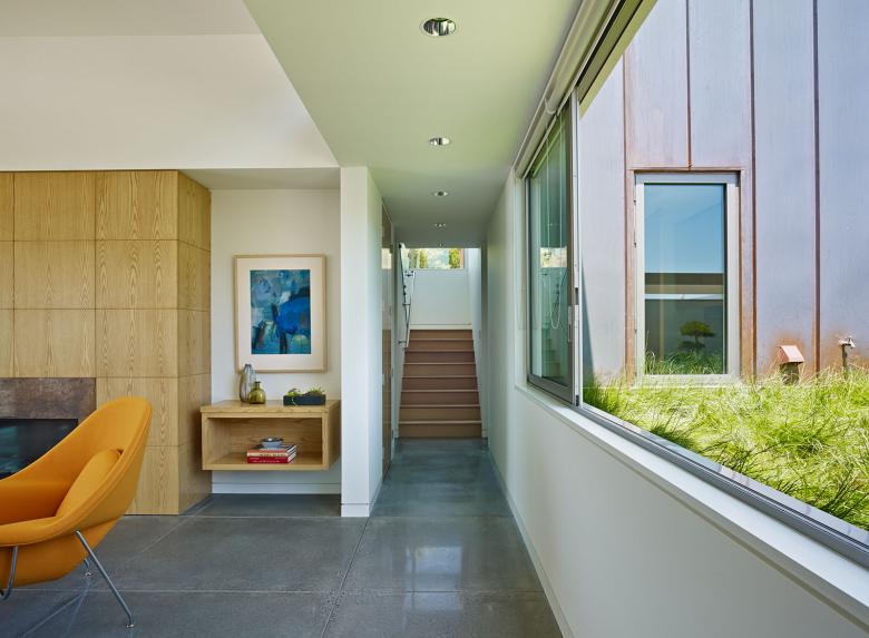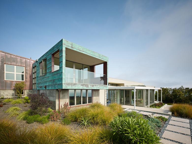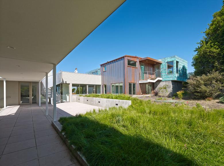 Sustainable products are used throughout the residence: concrete and bamboo flooring, high- efficiency plumbing fixtures are used in the interior, and recyclable metal studs and steel for structure. The exterior is sheathed in a combination of natural and recycled materials. Fiber cement panels in natural hues, and metal panels of copper patina and bronze- coated zinc help identify spatial functions within the residence and blend into the natural environment.