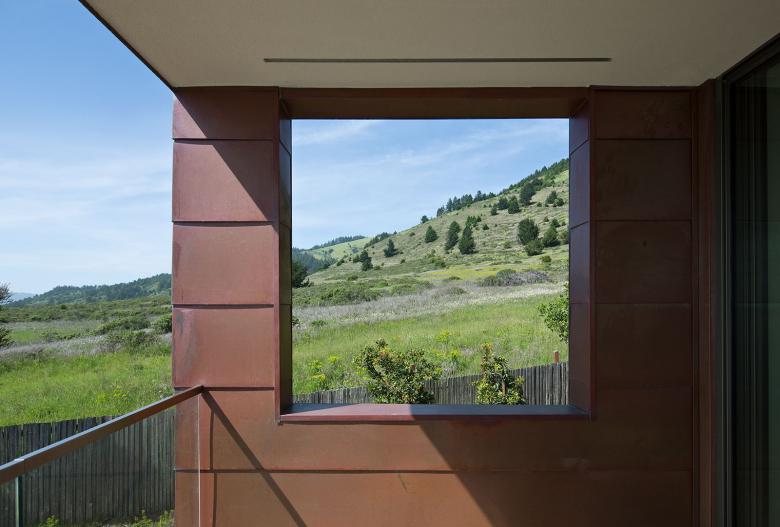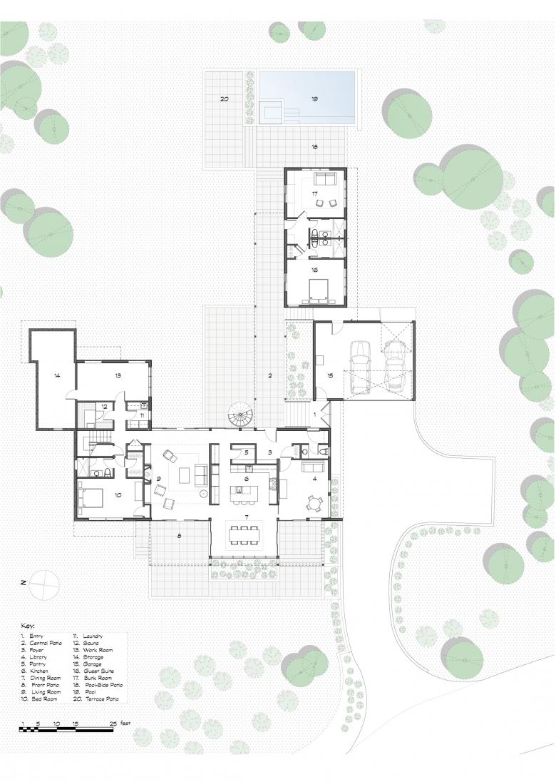Organized about a central courtyard, the home is reminiscent of a small clustered village. The courtyard divides the residence into two sections: one for the family and one for a guest wing and pool house. The use of large operable windows, integral outdoor spaces, and indigenous plants diminish the boundary between interior and exterior spaces. Zinc and copper panels on the exterior identify spatial functions within the residence and blend into the natural environment.
