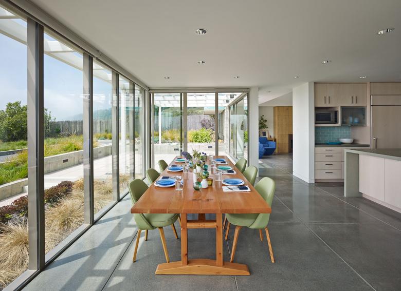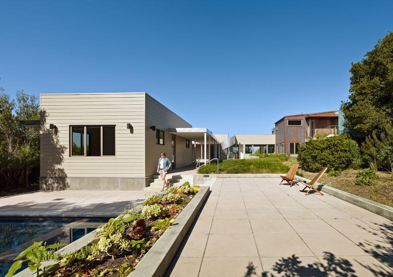 Sustainable design was important in the overall design. Vegetative roofs filled with regional plant material reduce storm water runoff and help the building blend into the natural environment. Pervious paving at the driveway and numerous outdoor terraces also aid in reducing storm water runoff. The building is energy efficient, using solar systems for both heating and hot water systems. An efficient, single-room width design and placement of large operable windows on opposing sides of the structure take advantage of natural breezes off the ocean, allowing air to pass through the building, providing natural cooling and eliminating the need