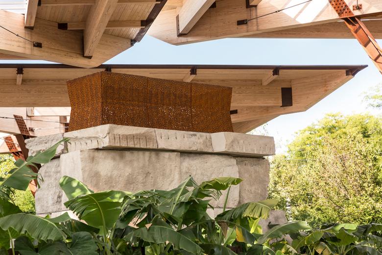 When water contacts the Pavilion’s canopy, it is funneled into the pods, down their rain screens of custom-designed, laser-cut weathered steel, to a sunken, plant-filled bed below, through a water quality unit, and finally to a 14-foot deep water detention bed of free draining stones, designed to accommodate 100-year flood events. Within each bed are plants selected to thrive in saturated environments and water intake pipes that are intentionally raised above grade to encourage natural percolation through the soil.