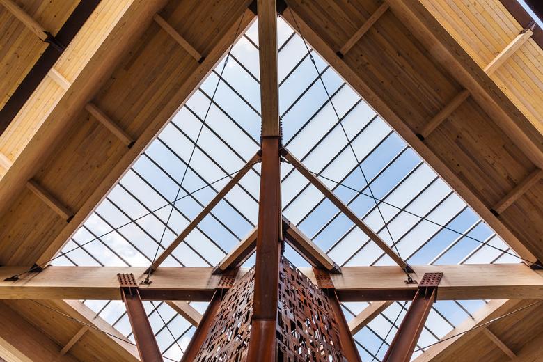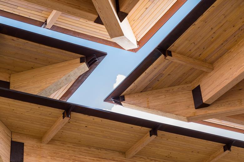 Each pod consists of 63 individual glulam Southern Pine wood beams by Glue-Lam Erectors, ranging from 83 feet long and 19,000 pounds to just three feet and 25 pounds. Translucent roofing materials (U-Lite Monolithic polycarbonate standing seam panels by CPI Daylighting) allow sunlight to filter through to the ground below, and the entire "forest" of pods is held together with 6,424 bolts and lag screws. Beneath the 35-foot canopy, a hearth of rough-back quarry block Indiana Oolitic limestone serves as a visual centerpiece and will provide warmth during colder weather.