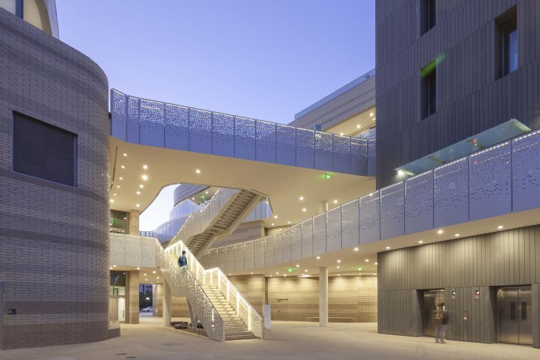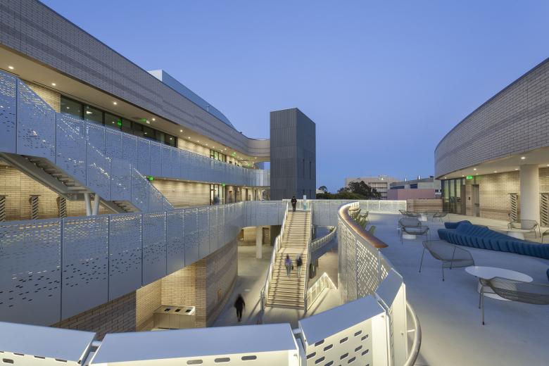 The building is inspired by both the campus and environmental context. The architecture and the material palette take advantage of the climate and echo the colors and textures of the nearby seaside cliffs and neighboring campus buildings.