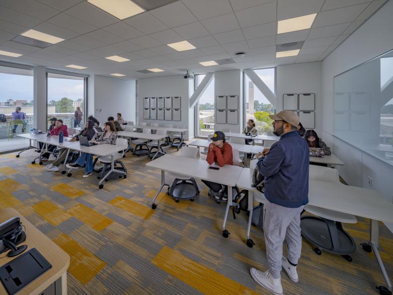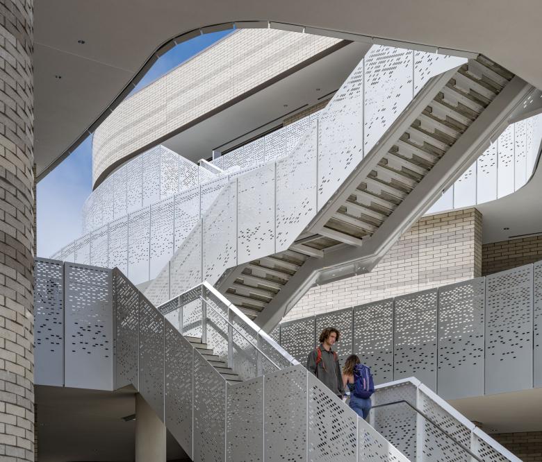 The building design anticipates the extension of Library Mall and is configured to be approachable and welcoming from all edges. It is composed of two main volumes with a central circulation corridor open to the exterior with terraces, stairs, and collaboration spaces. This open-air “street” interconnects the functions of the two volumes and encourages serendipitous interactions among students and faculty.