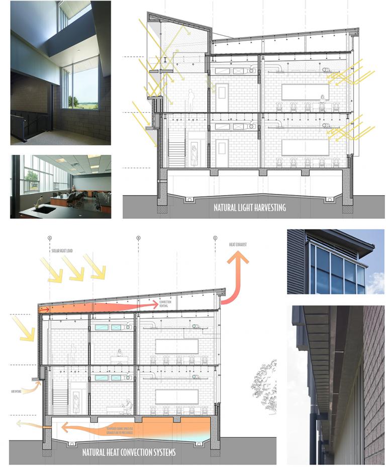 The building is constructed of durable, lifetime materials; zinc, high-performance curtain wall, and brick. Polished concrete, exposed steel, and ground-face masonry form a rich environment of natural material and light. The full-glass walls on the north diffuse natural light deep into each classroom and laboratory. A light harvesting system provides minimal artificial light as needed. The shape and double-shell enclosures shield the building from heat and move and vent heat and humidity out of the wall and roof sections. The design fostered efficient HVAC zoning, easy maintenance and adjustment.