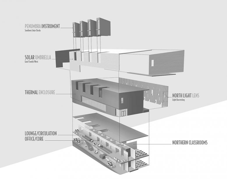 The south side of the building is a plural space for education outside of the classrooms. Hallways, stairs, lounge and study areas are intermingled on both floors overlooking the airport runway. Solar access is limited by dormers (penumbra instrument) that act both as environmental clocks and shade control devices. The classrooms are located on the north of the building. A northern light lens (curtain wall) diffuses and amplifies natural light into the classrooms. These light control and harvesting lens strategies proved to be even more effective than the models. The variety and character of light has also made this building the most desirable on campus.