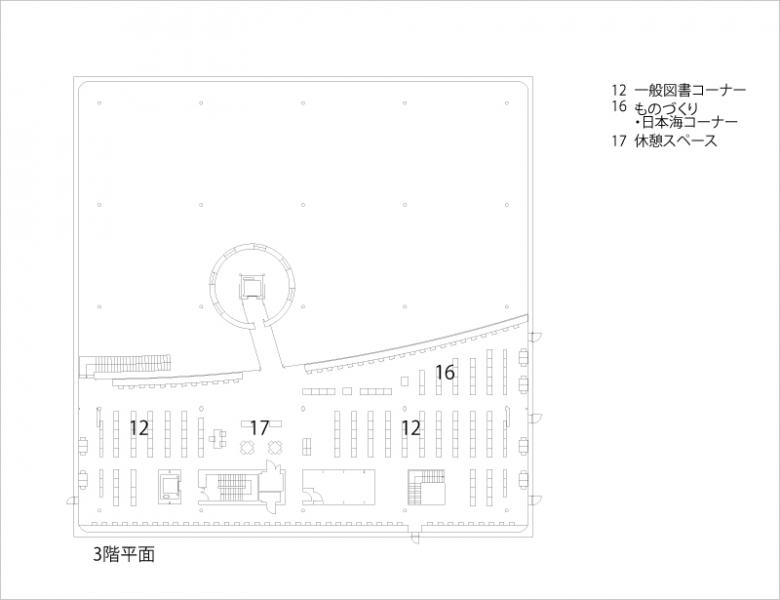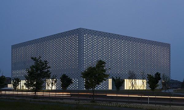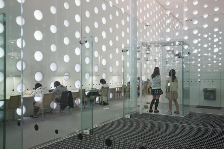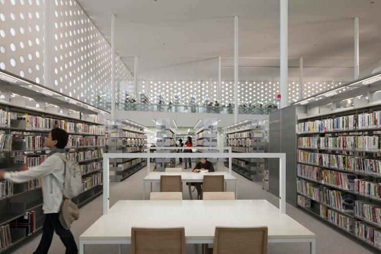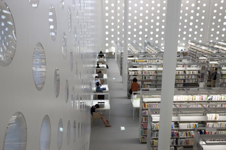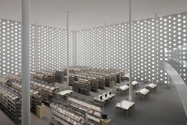 The library is one of four in the city of Kanazawa, with about 400,000 books in its collection (270,000 in open stacks, including 45,000 children’s books, and another 130,000 in closed stacks), as well as halls, group activity rooms, meeting rooms and other community exchange facilities. We felt that providing a comfortable place for reading books was key in a public library. There’s no question that there’s a unique pleasure and richness to the experience of sitting down to read in a room filled with books, of being surrounded by the overwhelming presence of physical books. That’s something you just don’t get with convenient electronic reading materials. We proposed a simple space composed of a 45-meter-square, 12-meter-high room supported by 25 pillars and surrounded by four perforated walls, with no divisions between the reading areas and the open stacks. The sense of volume in this large space was our way of representing a "library-like" reading room.