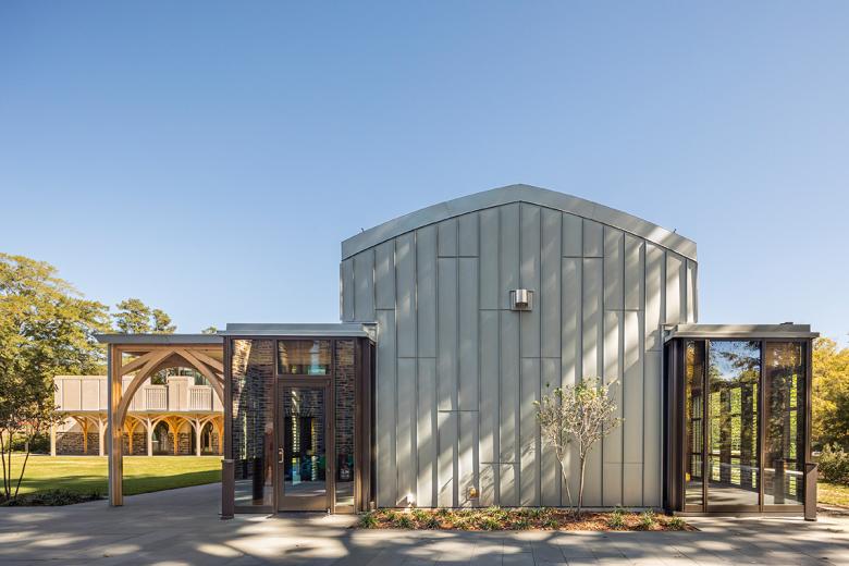 A variety of mullion caps provide texture and life to the glass curtain walls. Duke’s own stone, used throughout its West Campus and quarried nearby, creates a solid base suggesting permanence and protection. Precast panels on the exterior upper walls of the Events Building reflect the patterns found on similar material in the neighboring campus. Zinc roofing is brought to grade on the end walls of the meeting pavilion, where the glass wings and solid center ‘rhyme’ with the glass center and solid wings of the main pavilion. A number of Duke’s gothic windows are reproduced in perforated wood panels (of Duke’s own timber) along the side walls of the events hall; these provide acoustic softening to accommodate a variety of activity from concerts to lectures to passing crowds.