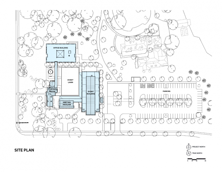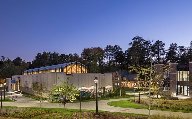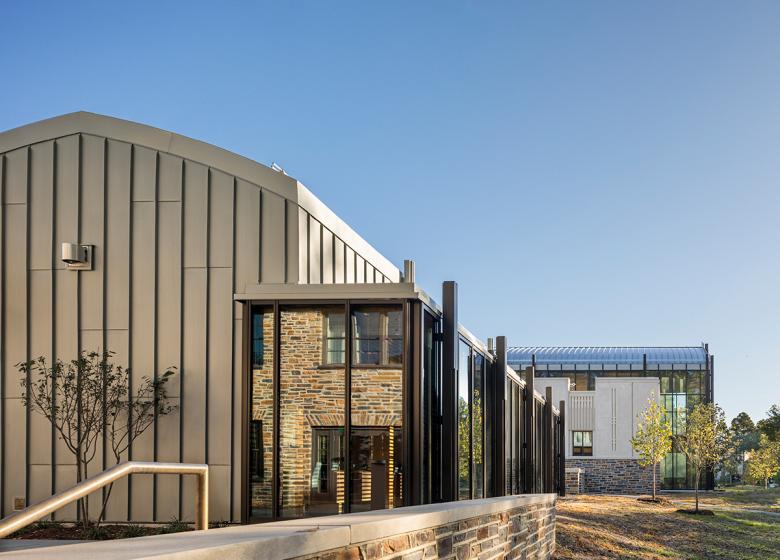 This is an alumni and visitors' center with alumni association offices located just outside the main entry to Duke University’s renowned Gothic Revival West Campus. It is adjacent to admissions buildings and thus welcome students of both the past and future. It is located in a semi-residential neighborhood, including a number of traditional houses designed by the original campus architects Julian Abele and Horace Trumbauer. This suggested that the large complex be broken into smaller pavilions to maintain rhythm and scale. These surround a celebration courtyard that recalls the classic contained spaces of the campus beyond. The whole is surrounded by woods, in keeping with Duke’s self-vision as a "University in the Forest."
