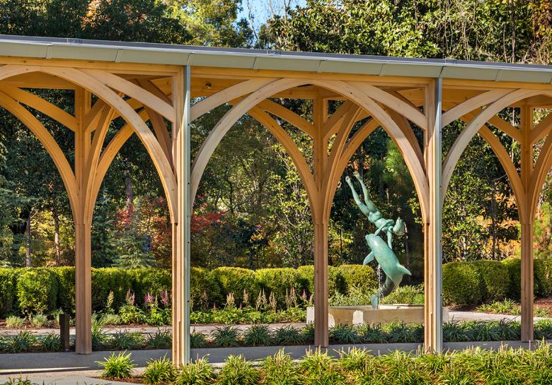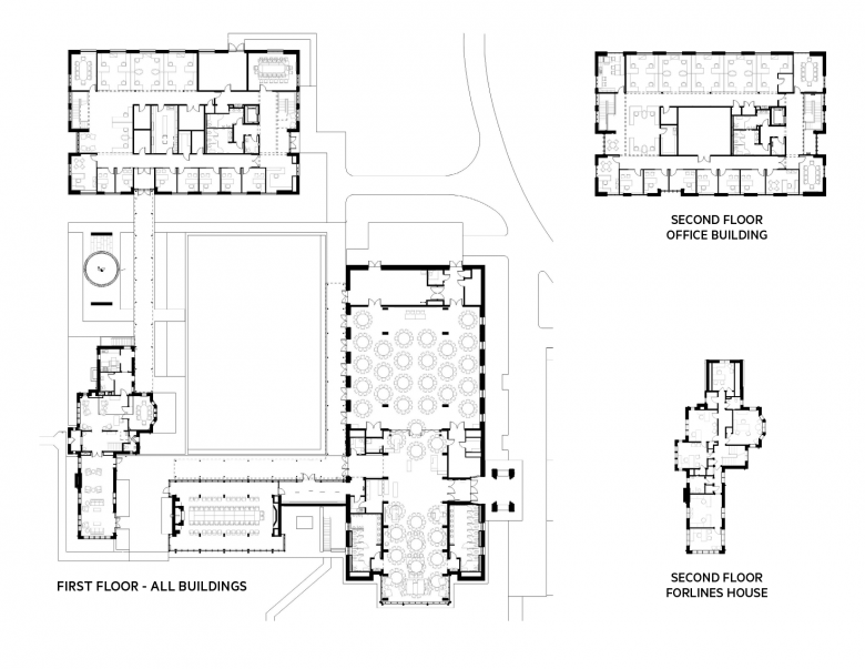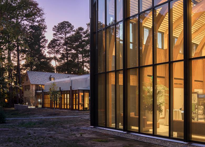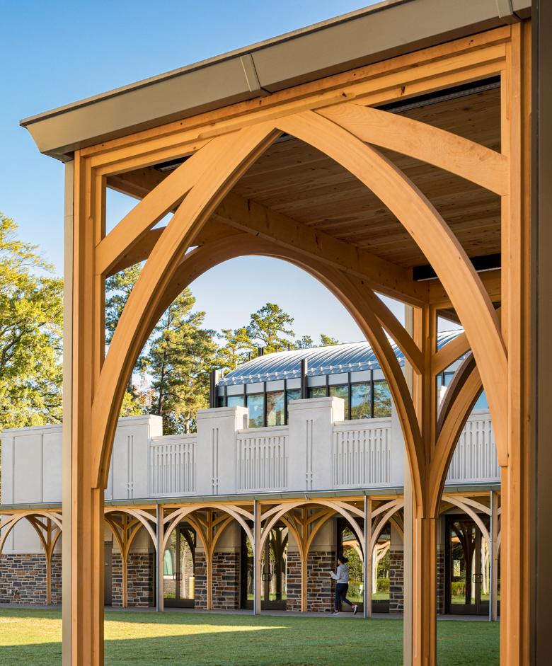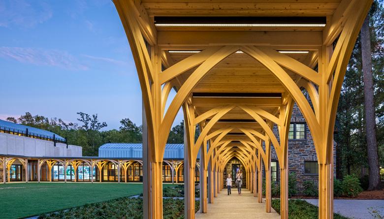 Duke asked that its Alumni Center reflect Duke imagery and traditions, without pure replication. The complex had to look both forward and backward – to Duke’s historic campus and an ambitious and adventurous future. The visitors’ center Gothic wood arches support modern glass skins alongside Duke stone exteriors. The Duke stone Forlines House is integrated into the whole by a modern wood cloister surrounding the central court. A simple rectangular two-story office building completes the enclave.