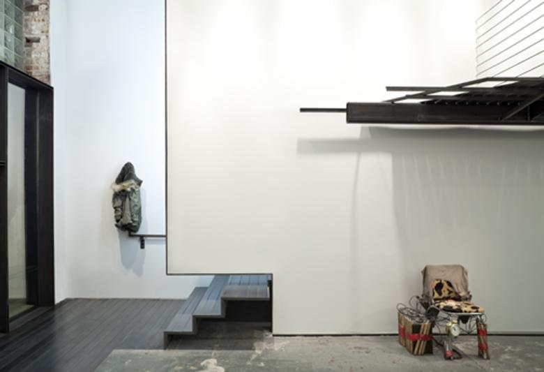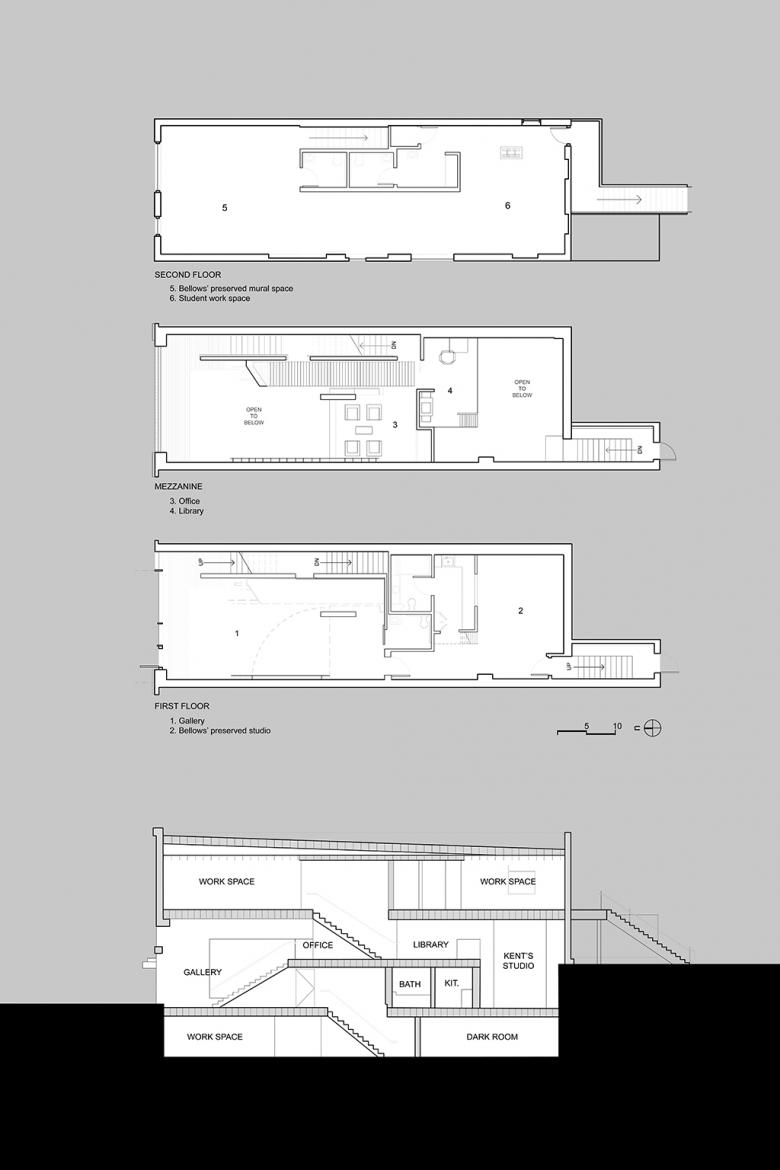 The renovation of the artist's late 19th-century two-story brick building consisted of a new storefront, ADA bathrooms, gallery space, library, office space, multi-purpose workspaces and preservation areas of the artists studio and backdrop installations. The project preserved several of the artist’s artifacts that tell a story about the artist and how he thought: the gallery floor (preserved under clear polyurethane), his parka, glass block transoms, moving backdrop wall, books, collages, light fixture pulley, wall mural, and wall installation.