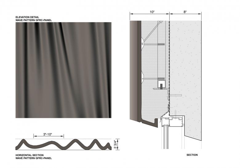 The façade is made from custom glass fiber–reinforced concrete panels. Their rippled, curtain-like pattern of vertical folds creates a play of light and shadow and softens the primarily glassy exterior. Beneath, large exterior windows provide direct natural light, while south- and east-facing clerestory windows provide indirect light that bounces off of the exposed concrete of the lifted facade. Not only expressive and functional but also structural, this concrete band acts as a 200-foot-long beam to support the green roof without interrupting the open interior. Two columns are the only supports for this beam.