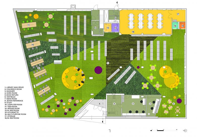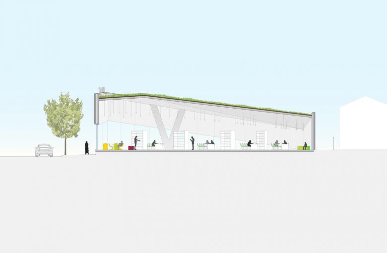 The focal point of the new design is the public space along the library’s perimeter, occupying the setback between the pre-existing building’s footprint and the sidewalk. Capped by a green roof, this perimeter zone joins existing gardens around the library’s back sides to form a continuous loop of green. Inside, the perimeter zone is conceived as a band of open rooms to be used by each of the library’s different user groups: adults, teens, children and staff.