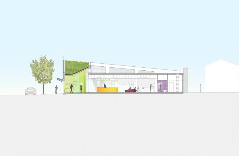 The new façade is a physical and metaphoric lifting up of the library’s exterior walls in order to broadcast the activities of the library to the outside. At the site’s most public corner, the roof reaches monumental scale. A second, smaller peak at the children’s corner provides child-sized views to the south. Between these two peaks, the façade dips down to provide privacy at the staff and book drop areas behind. The section of the façade at the entrance folds out over the street to make an awning— reminiscent of a folded page in a book. On the north side, the façade descends again, providing privacy for a teen study area while also bridging the difference in scale between the library and its residential surroundings.