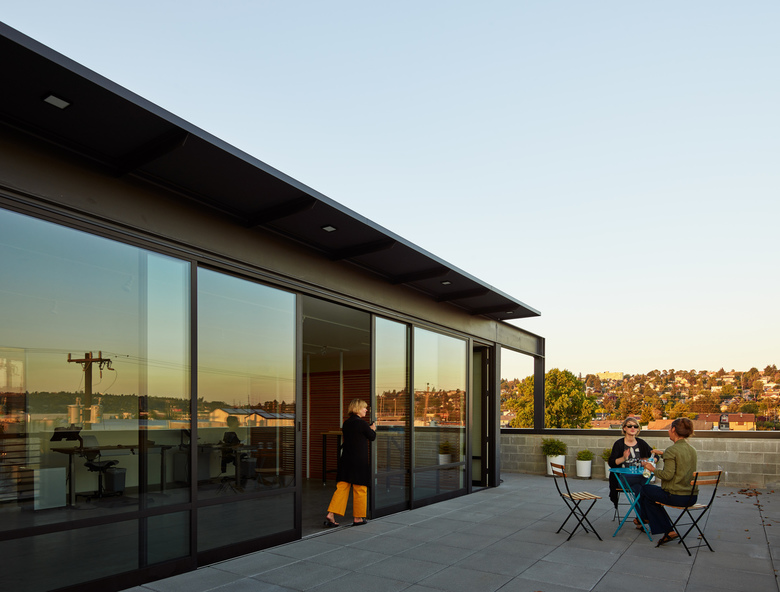 Sustainable features include rainwater cisterns that collect and recycle all on-site rainwater for use in irrigation and flushing toilets, roof-top solar panels, energy efficient radiant heating, thermally efficient, operable windows on the north and south sides of the building to encourage cross ventilation, and operable sunshades on the exterior, giving tenants control over natural ventilation and direct solar gain management. As an infill project in Seattle’s Industrial Buffer Zone, this project is a study in successful urban densification, drawing new life and vitality into the neighborhood and spurring further positive development in the area.
