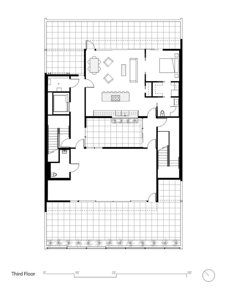 The modest size of the lot — 4,300 sf — meant that every square inch of space of was organized as efficiently as possible in order to maximize usable/leasable areas and to make the project as dynamic as possible. The narrowness of the site and the owner’s desire to optimize the developable square footage of the building led to the design of the continuous party walls along the east and west property lines. This approach places the majority of the design focus for the exterior of the building on the narrow, street facing, south façade of the building, with key design elements being the large expanses of glazing and operable screen system.