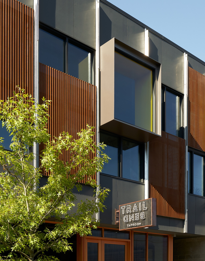 Riffing on the idea of shifting uses, the design takes its visual cue from a sliding tile puzzle, also known as a klotski, where the object is to rearrange tiles to solve the puzzle. The puzzle is expressed on the south-facing exterior of the building through the use of large, counter-weighted 7’x10’ corrugated perforated Cor-ten metal screens. The screens slide up and down, changing with the users’ needs (and whims) for sun shading and privacy, and in response to seasonal variations in daylight. At sidewalk level, the building has expansive 12’ tall storefront glazing composed of VG fir/glass sliders and fixed units revealing the activity inside to the street.