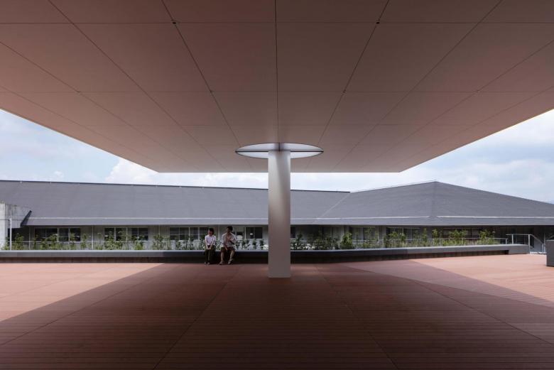 A column supports the canopy over the rooftop plaza. (Photo: Shigeo Ogawa)