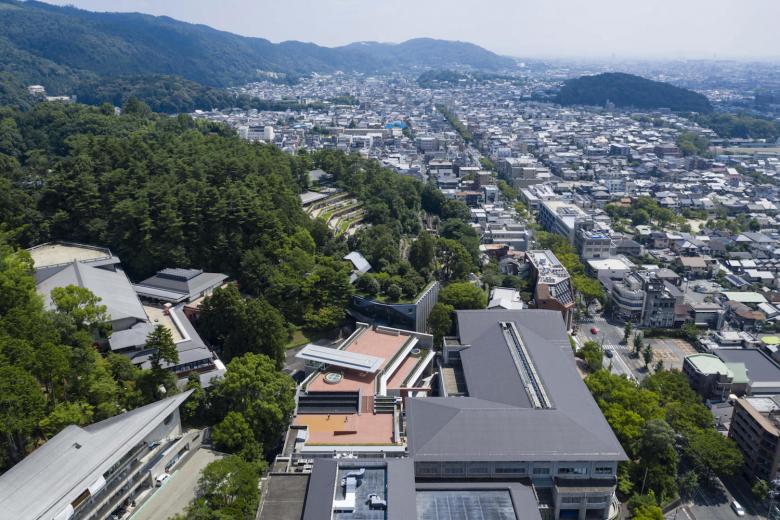 The campus is spread over a verdant hillside in the mountains on the outskirts of Kyoto. By turning the center of the campus with its ten-meter-high retaining walls into an architectural element, and by transforming its roof into a sky garden, we hoped to create a new planar plaza for the campus. Another central theme was using the structure to link circulation routes vertically, since they had previously been cut off by the retaining walls. The staircases connecting the structure from bottom to top as well as the walls that vertically link the four interior levels follow the lines of the brick tile facade, which is a homage to the original Botenkan. The retaining walls and brick tiles remain in the same places they were before, as memories of the previous structure.