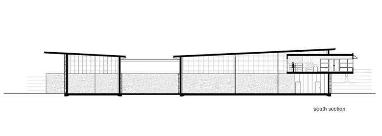 To minimize temperature swings the building was set into the hillside, and rocks from the site were set in baskets (gabions) on the front façade to absorb heat during the day to be release that heat at night. All the exterior materials are low maintenance and simply detailed.