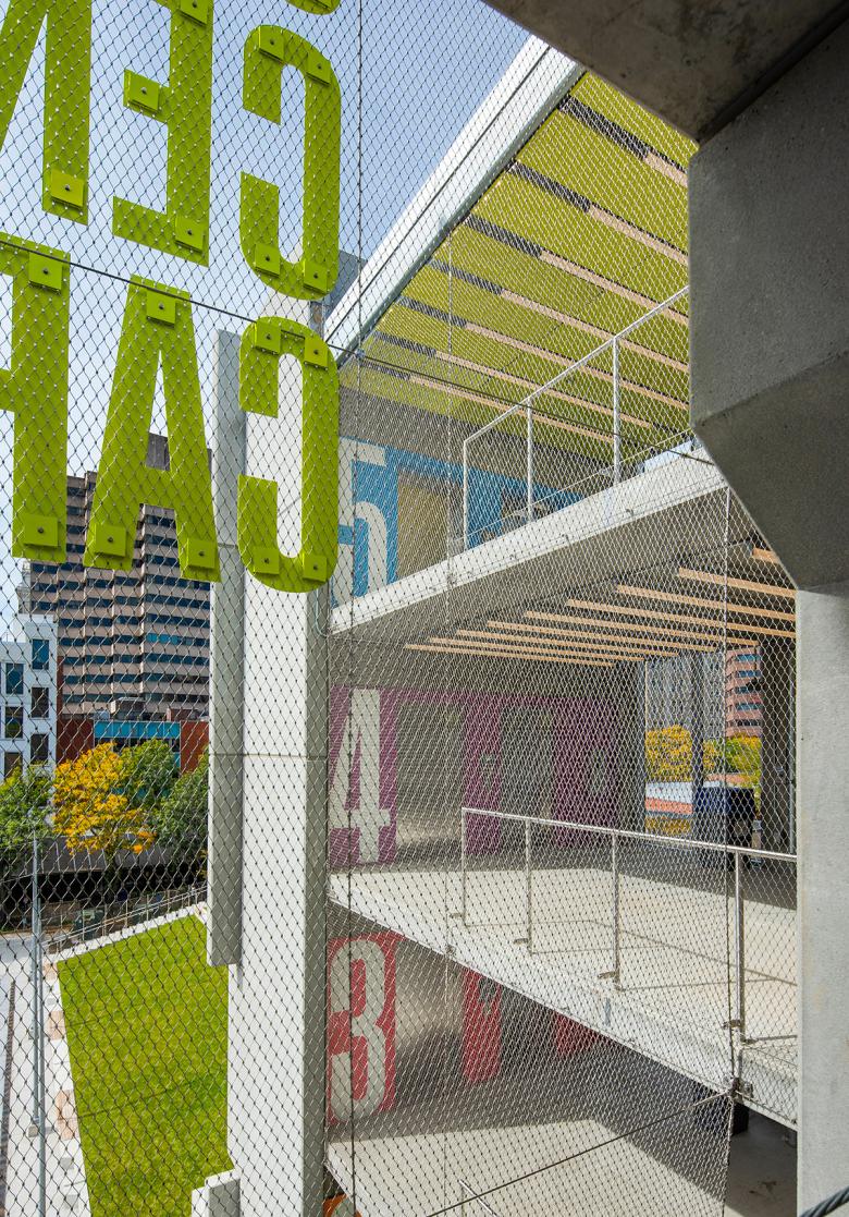 Graphic placemaking and elevator core (Photo: Anton Grassl)