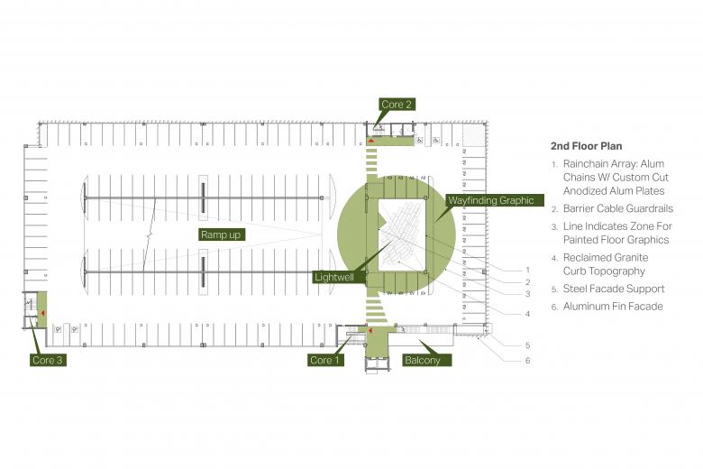 The CarPark reimagines the role of structured parking within a dense urban fabric, creating a welcoming arrival point by prioritizing public presence, pedestrian experience, and natural systems. The building facade uses large-scale environmental graphics and a language of repeated mechanical parts to project its function to visitors and passing drivers. Inside, the pedestrian circulation is organized around a central lightwell, which brings natural daylight and air deep into the building. Glazed vertical circulation cores are located on the perimeter to orient visitors to the city’s Museum District and Downtown Connecticut Riverfront with its history of Springfield transportation and trade. The site design transforms the adjacent vehicular street into an active pedestrian lane with 10,000 square feet of retail and outdoor seating that links the CarPark’s pedestrian entry with the convention center.