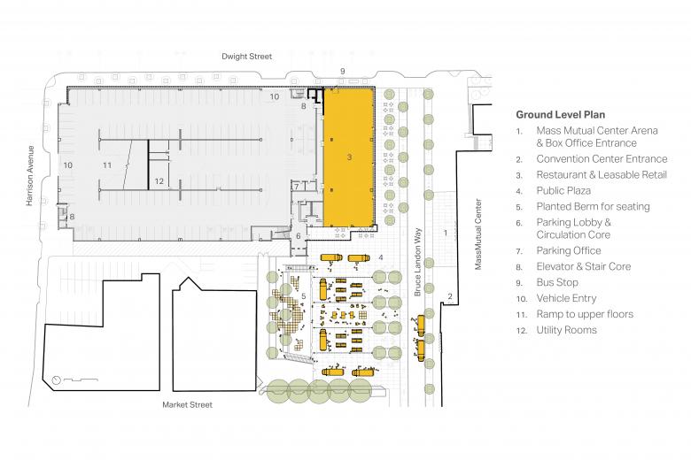 The original program brief included a parking structure and pedestrian bridge connecting to the convention center. A series of collaborative project visioning workshops with the client, city agencies, and community groups produced consensus that Springfield would be better served by a new public plaza rather than an enclosed pedestrian bridge. The scope of work expanded to include a landscaped civic plaza on the adjacent surface parking lot, funded by budget that had been allocated to the bridge.