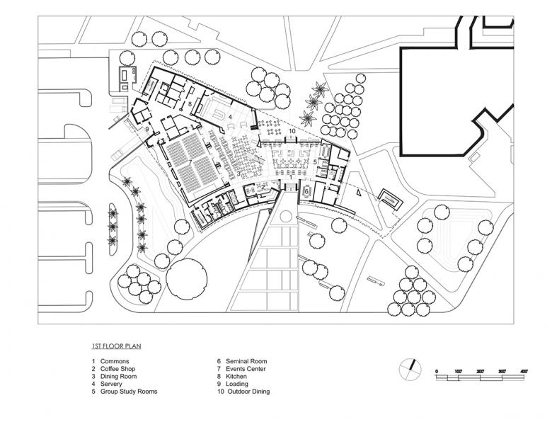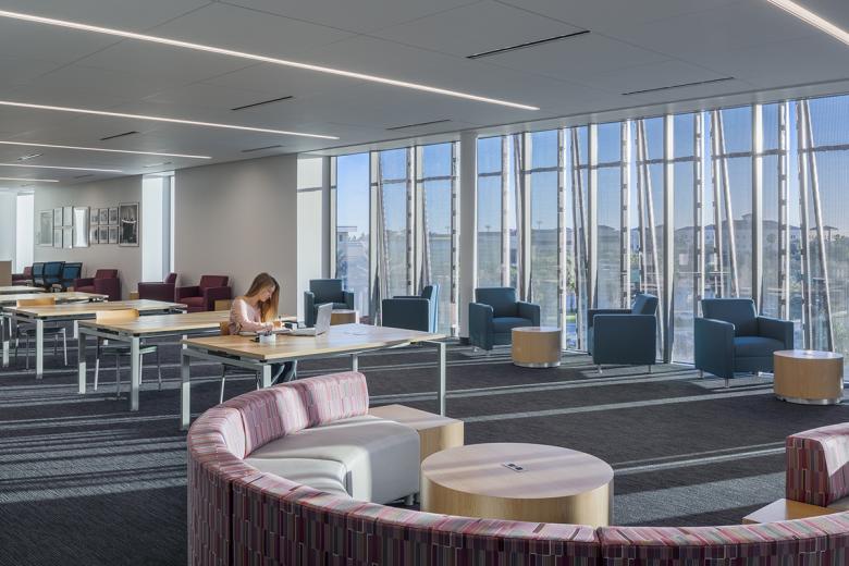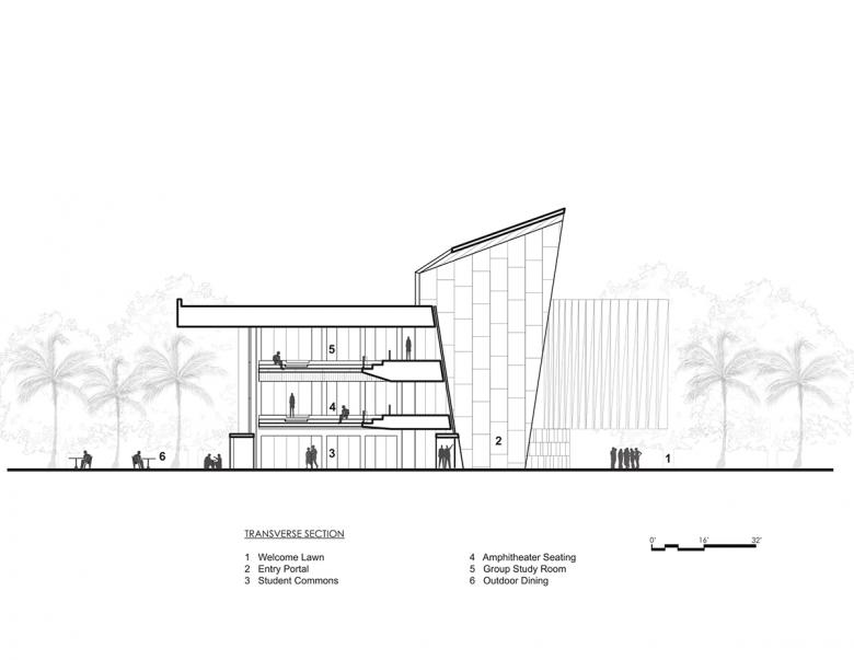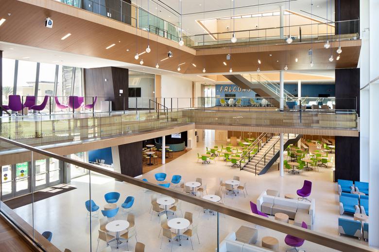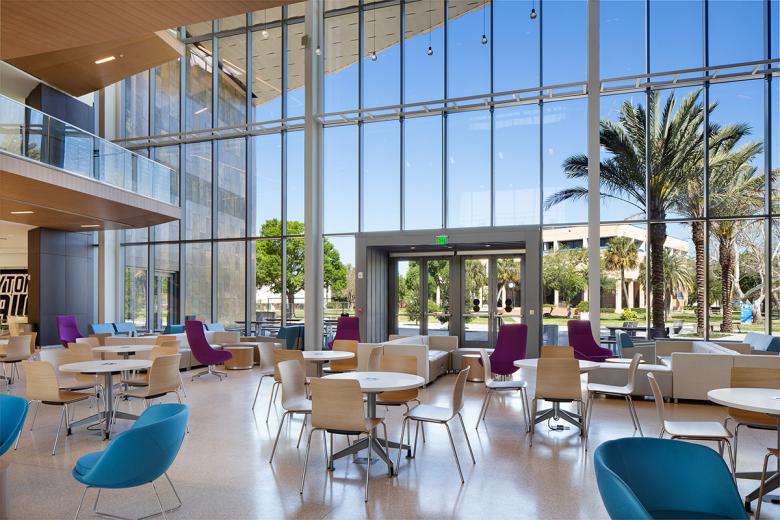 Internally, a three-story commons overlooks the campus quadrangle and serves as the campus living room and allows for the showcasing of student work. A rich mix of program spaces keeps these commuter students on campus all day and into the evening. Dining, a coffee shop, gaming lounge, and group study rooms ring the student center commons. An amphitheater on the second and third floors cantilevers into the commons and looks out onto the campus quadrangle. The amphitheater provides a theatrical experience giving students the ability to see and be seen, thereby reinforcing a sense of community and belonging. Other program components housed in the student center include a 500-person events center, student club and organization offices and workspace, classrooms, career services, the writing center, and the college library. The educational and recreational programs enhance student life at Daytona State College and provide critical support services for transition to the work force.