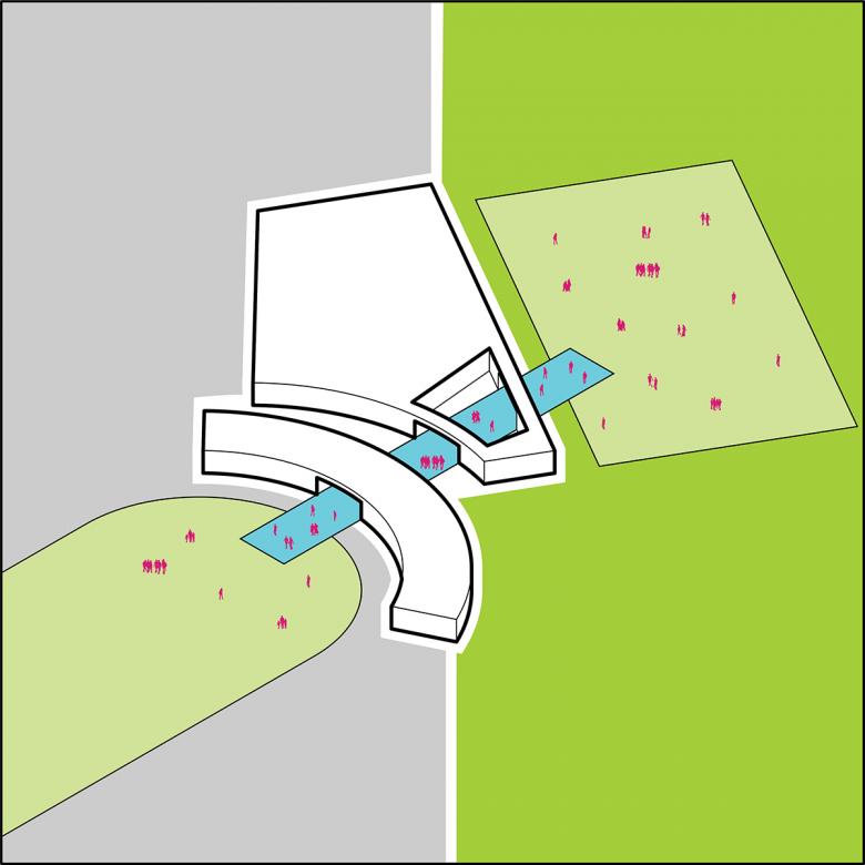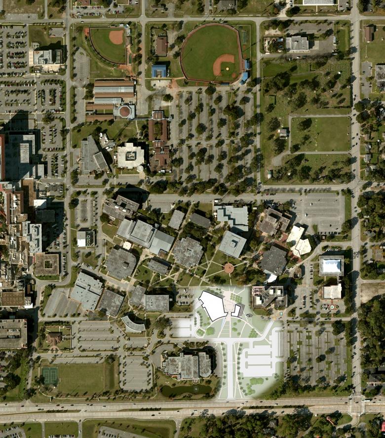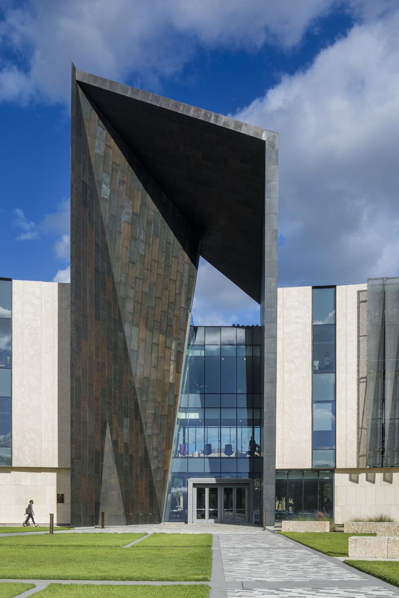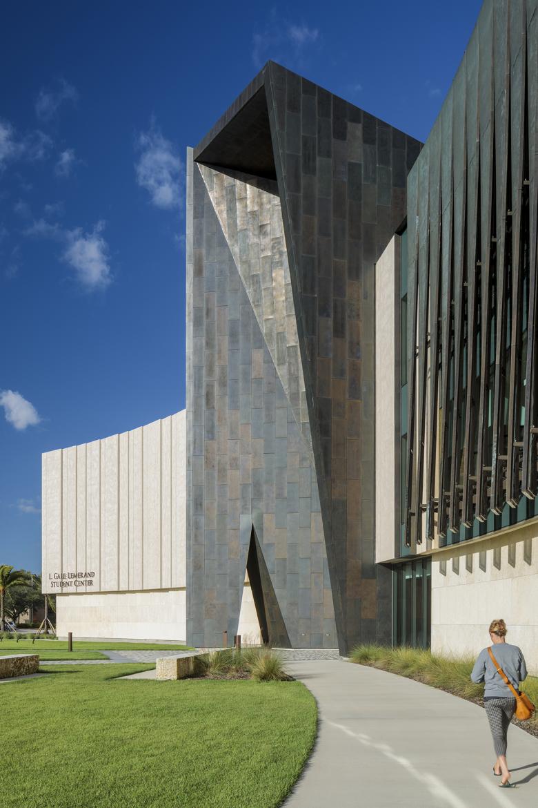The site is surrounded by vast surface parking lots facing International Speedway Boulevard, a main arterial road that connects Daytona’s famed beachfront with the rest of Florida. The campus turns its back on Daytona with inward looking and internally accessed buildings surrounded by these parking lots between the boulevard and the campus. This new student center was to transform the public appearance and experience of the campus by being a gateway between Daytona State College and its adjacent community thereby strengthening town-and-gown relationships. The design responds to this unique site condition and aspirational goal to change the campus's relationship to the town by creating an organically curving coral stone and bronze wall that faces International Speedway Boulevard and embraces the visitor like two outreached arms forming a landscaped welcome lawn at the campus entry. Rising from the center of the gently curving wall is a bronze portal framing the opening to the student center and giving passage to the main quadrangle and campus beyond. This composition of elements and regional materials establishes an outward presence to the campus along Daytona’s International Speedway Boulevard and expresses an openness and welcome to the community.