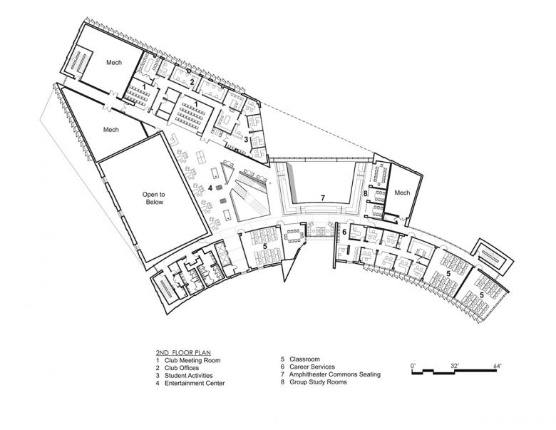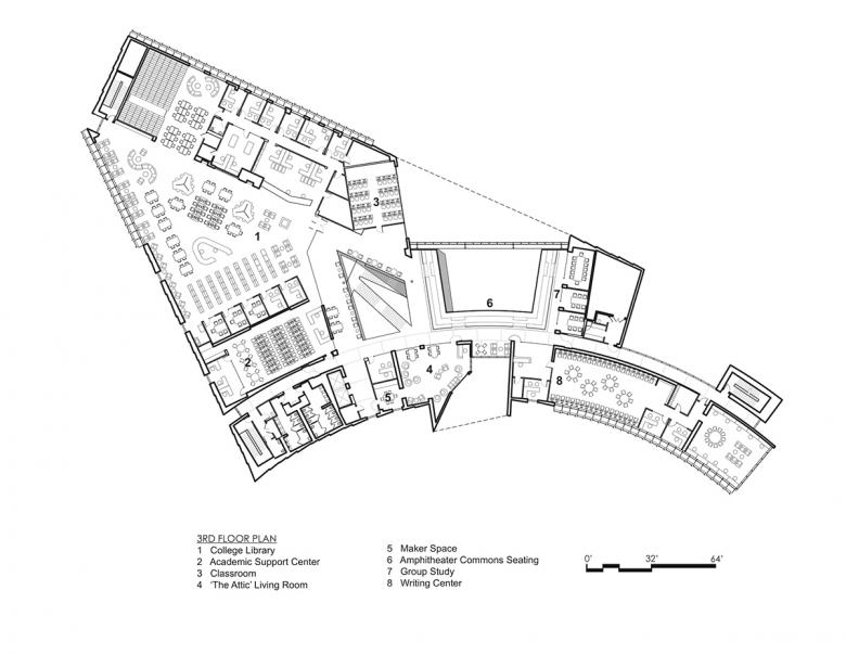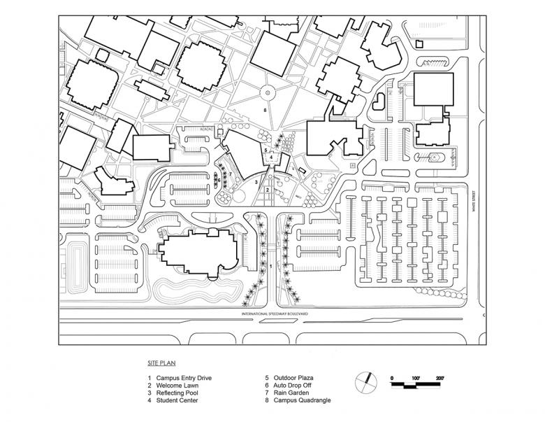 The L. Gale Lemerand Student Center is a 74,000-square-foot three-story new building at the entrance to Daytona State College that establishes an iconic portal to the campus and provides a central dedicated gathering space for a primarily commuter-based student body. The program of the student center is an inventive mix of traditional social and study spaces (group study rooms, casual meeting areas, dining, café, events center, etc.) and work force transition spaces to better prepare students for successful employment (career services, tutoring and mentoring center, writing center, the college library, etc.). This blend of social, study and mentoring spaces are intended to give students support for transition to the work force and offer a place for potential employers to showcase student work.