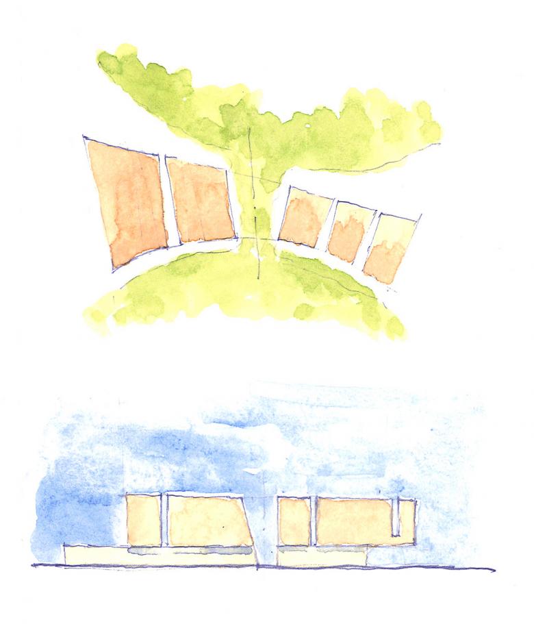 The final composition of the student center was a result of a collaborative design process that guided and incorporated the objectives of the design committee. The design committee was made up of the student representatives (president and vice president of student government), faculty from student support services, college administrators, college trustees, and councilmen from Volusia County. This diverse and rich board was charged with shepherding the design process. During the process, we offered multiple options for meeting their aspirations and enclosing the program. This design committee selected the final concept; however, the giant portal in the center of the entry facade was a direct contribution from the committee and was not part of the original concept. During schematic design, the councilman from Volusia County, who sat on the committee, expressed an interest in having this project more aggressively express its openness to the community. He suggested that a formerly proposed tower, in concept design, was not appropriate as an expression of welcome and openness because it had defensive and isolating historic origins. He instigated a discussion about the appropriateness of a welcoming element that would transform Daytona state College’s appearance in the community. From these conversations a ninety-five-foot-high bronze portal developed as an iconic symbol along International Speedway Boulevard that figuratively and literally connects the center of campus with the surrounding community.