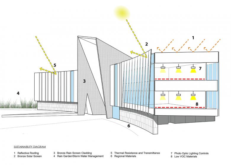 The design of transparent south-facing building wings, like embracing arms to express welcome and openness, also presented a significant design challenge for combatting solar heat gain in the harsh Florida environment. We took the opportunity to design image-forming bronze solar screens and a naturally ventilate bronze rain screen facade to reduce heat gain and demand load on the cooling systems. Custom bronze perforated solar screens are veiled over large, glazed areas of the south and west facades to limit heat gain and glare while allowing views outward from the classroom, tutoring center, and career services. Other sustainable strategies include the use of pre- and post-consumer recycled materials, reclaimed rainwater for irrigation, photo optic lighting, and high-efficiency heating ventilation and air conditioning systems.