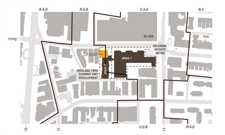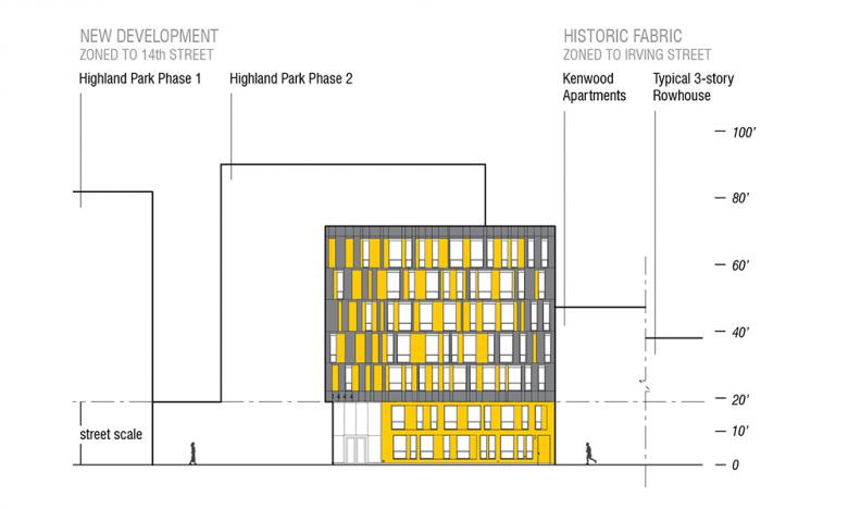 La Casa’s seven stories also help to make the transition from the nine story buildings that face Fourteenth Street to the lower four and five story buildings that comprise the Irving Street residential neighborhood behind.