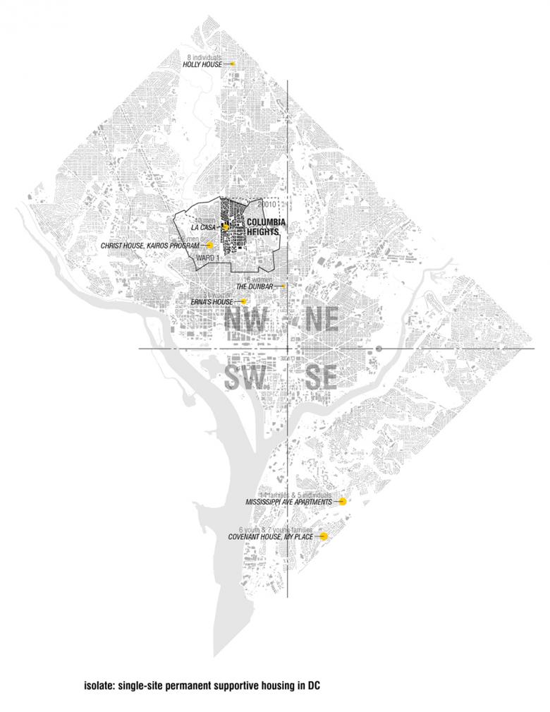 This project is a permanent supportive housing facility designed for, and operated by, the government of the District of Columbia. “La Casa” is the first permanent supportive housing project for the District’s Department of Human Services. The project consists of 40 single-occupancy units with community and support spaces covering 24,946 square feet. Currently the city operates a variety of housing types and models to accommodate the homeless, most of which focus on temporary, nightly shelter. The La Casa Permanent Supportive Housing Project is the first to develop private dwelling units, with full living spaces, kitchens and baths for the chronically homeless.