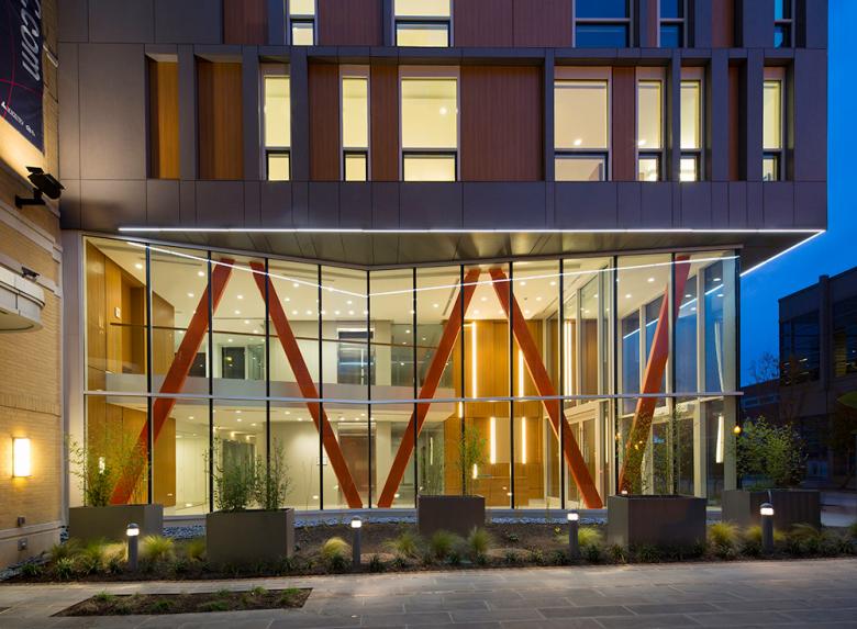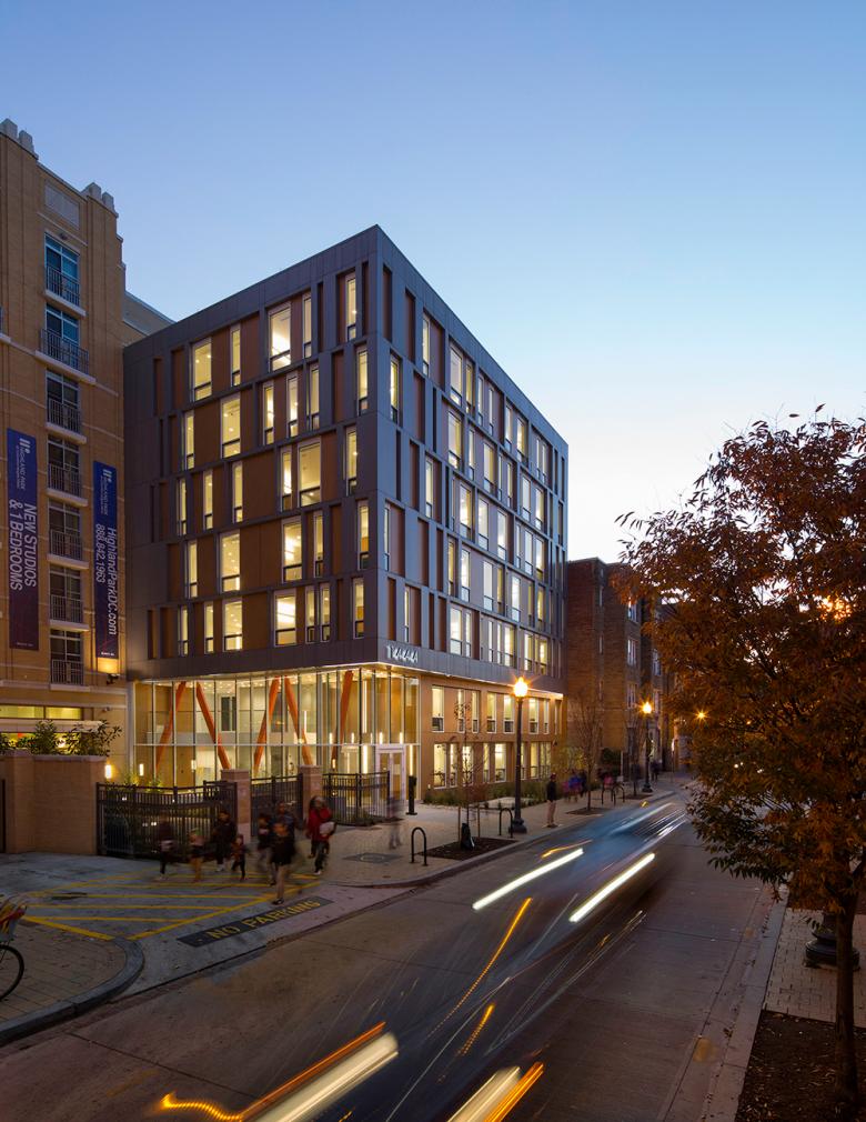The facades reflect the vibrant activity along Irving Street. The solid-void pattern of the façade emulates the adjacent multifamily residential buildings to achieve a contextual scale, and the fenestration further refines this texture while providing equal amounts of glazing for each dwelling unit. Above the street-level datum, the façade cladding-to-window pattern was developed to allow individuals to easily identify their particular floor and unit, and resultantly their place within the city. Below this same datum, the design team wished to emphasize entry and pattern through layering, spatial density and variations of light. The primary façade faces north, so the interplay of light, shade and shadow is limited. To circumvent this inherent flatness, the design team sought to employ the contrasting light from within each unit as darkened voids in the daytime, and illuminating beacons in the evenings. Between windows, the exterior cladding comprises a syncopated rhythm of gray cement board and Trespa panels. These materials were chosen for their aesthetics, durability and resilience. They reduce the municipality’s overall maintenance expenditures and provide integral beauty that augments the lively context of Irving Street, and the vitality of city night life.