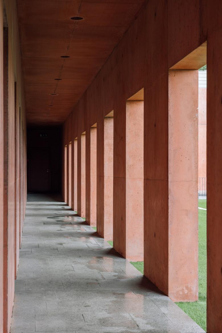 Built in reinforced concrete with iron oxide pigment incorporated into its composition, the retaining wall merges with the rocky outcrop, which also becomes a central element of the design. This blurs the boundaries between architecture, structure, landscape, and the natural terrain itself.