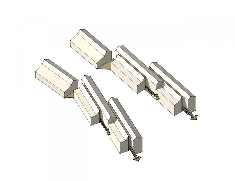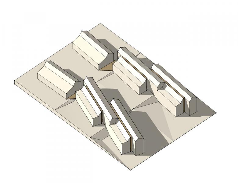 The site plan orients the mid-rise buildings along view corridors that also coincide with the optimal solar orientation. Building masses are lean, tall, and vertically articulated, and follow Princeton Campus Gothic precedents by stepping down the site contours. Layered massing and folded roofscapes also take cues from Gothic precedents and are enhanced by terracotta tile cladding and brick patterning to bring texture, detail and scale to the project.