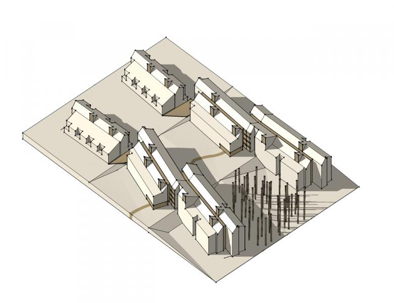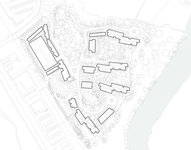 Buildings are placed on existing parking lots to maintain the old growth forest while reducing impermeable surfaces on site. Wooded areas, meadows and rain gardens between buildings help manage on-site storm water and improve the quality of runoff into the adjacent stream and lake. The team also worked with Princeton Township to keep streets narrow, like those on campus, to encourage slow vehicular speeds on the site. An extensive network of pedestrian pathways weaves through the community, connecting the buildings to each other and to the main campus to the north and east. A 504-car parking deck is located near one of the vehicular entrances, concealed from view by a wrapped layer of town homes.