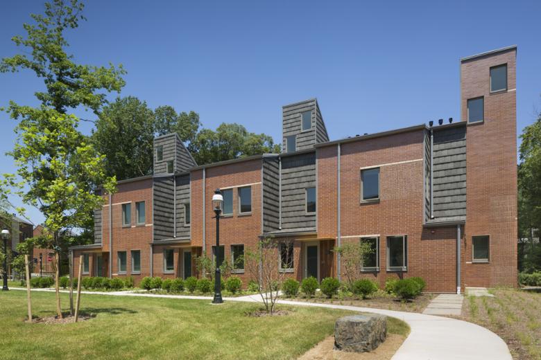 Lakeside’s siting, geo-exchange mechanical system and material choices contribute to an EUI (energy use intensity) of 28, exceeding Architecture 2030’s target reductions in energy use. A life-cycle cost analysis was performed to determine HVAC options, considering not just initial cost, but also the annual operating expenses and environmental costs, the latter of which is determined with Princeton’s self-imposed “carbon tax” of $35 per metric ton of carbon dioxide. The options under consideration had similar life-cycle costs—until the carbon tax was factored in. The result tipped the decision to the ground-source system. Additional sustainable features include the reuse of felled wood on this site for interior paneling at building lobbies, improved thermal envelopes, potable water use reduction as well as Energy Star lighting and appliances. The mid-rise buildings are designed to LEED for Homes Silver and LEED for Homes Gold for the townhomes.