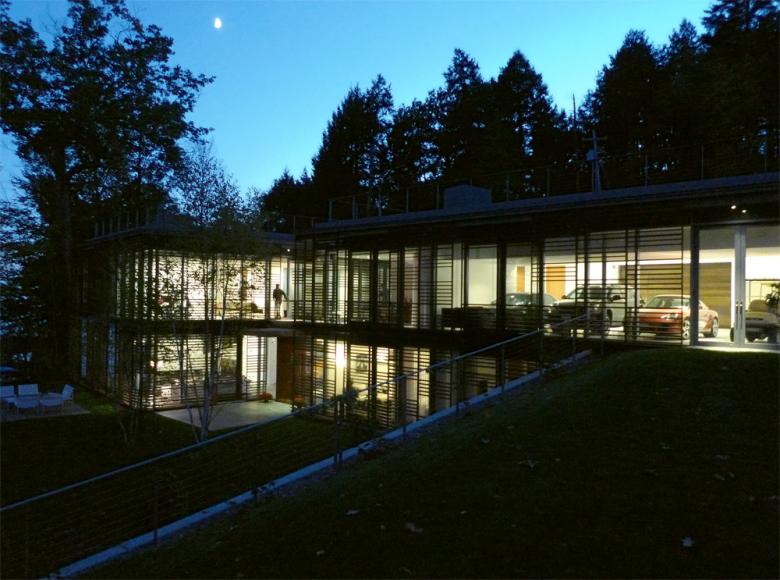 The client approached us to design and build a family retreat on a steep hillside along a beautiful lakefront to accommodate many guests staying lengthy times. The property afforded 180 degree views of the lake, but with a very steep 300’ elevation change. There was no flat land to build on. It was a sensitive site with the Lake Commission very concerned about the visual impact of large buildings on the lake.